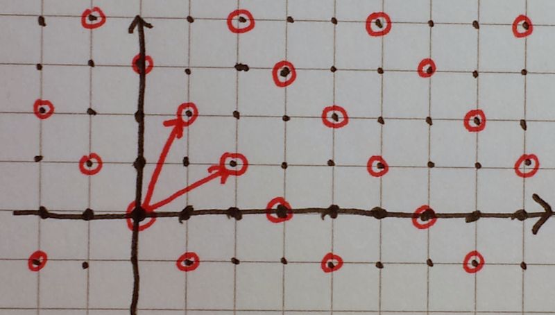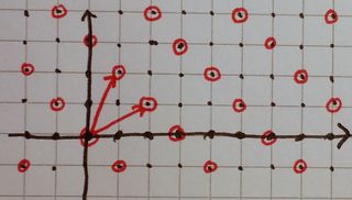 This picture demonstrates the space generated by the vectors [ilmath](1,2)[/ilmath] and [ilmath](2,1)[/ilmath] considered inside [ilmath]\mathbb{Z}^2[/ilmath]